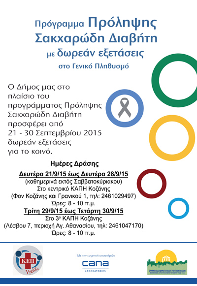 - 29/9/2015 έως και 30/9/2015 8-10 π.μ. στο 3ο ΚΑΠΗ Κοζάνης (Λέσβου 7 , περιοχή Αγ. Αθανασίου Κοζάνης , τηλ. 47170 )