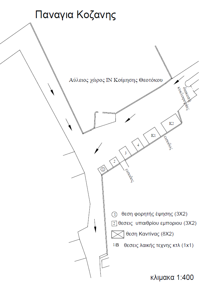 1) στην υπαίθρια αγορά επ’ αφορμή της εορτής Κοιμησης της Θεοτόκου που θα πραγματοποιηθεί πλησιον του Ι.Ν. Κοιμησης Θεοτόκου (Παναγία), στην Κοζάνη, για τέσσερις θέσεις διαφόρων εμπορευμάτων επιτρεπομένων σύμφωνα με το άρθρο 5 του ισχύοντος κανονισμού, μια θέση φορητής έψησης και δύο θέσεις καλλιτεχνημάτων και δύο θέσεις καντίνας.