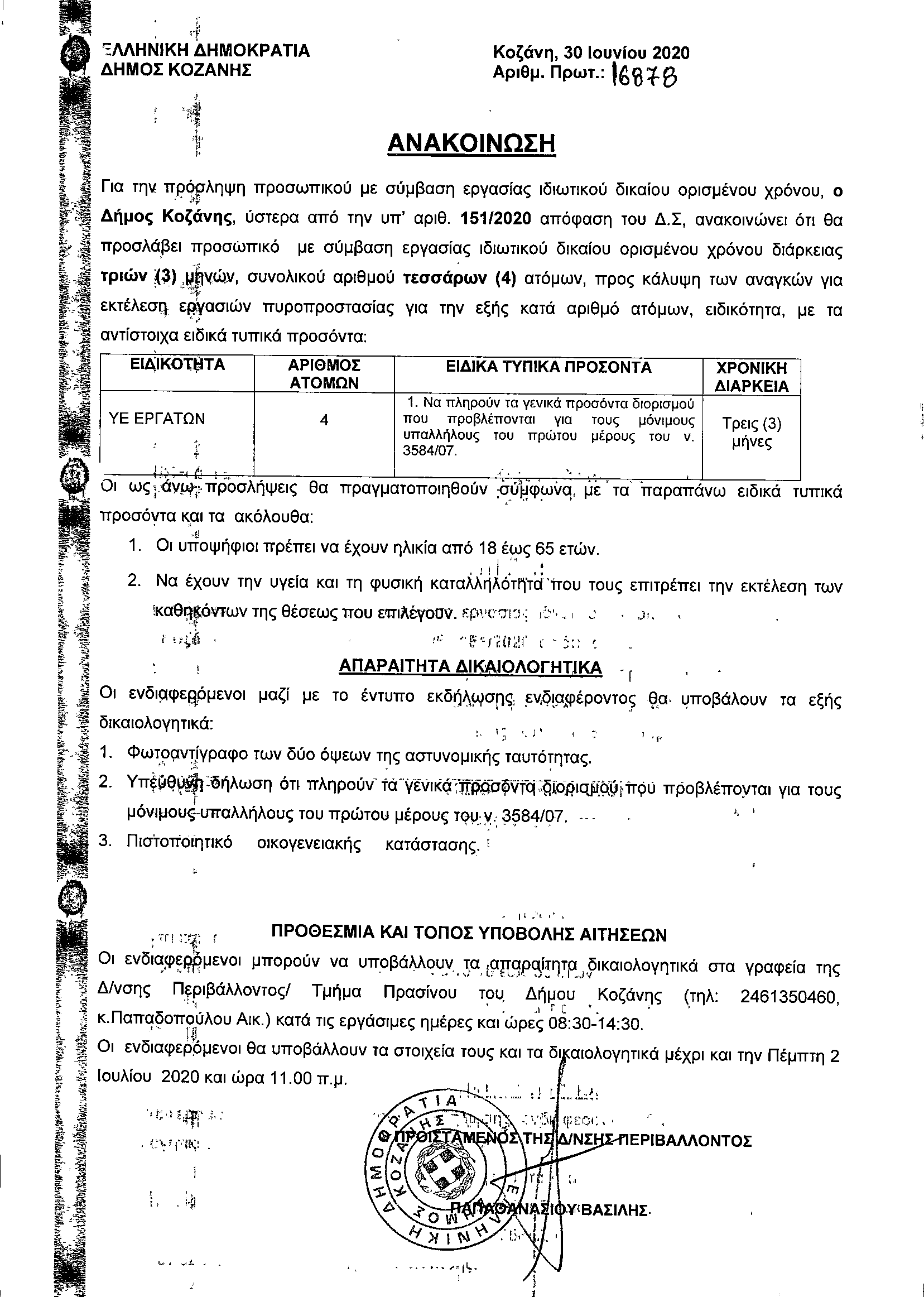 Πρόσληψη 4 ατόμων με τρίμηνη σύμβαση στη Διεύθυνση Περιβάλλοντος