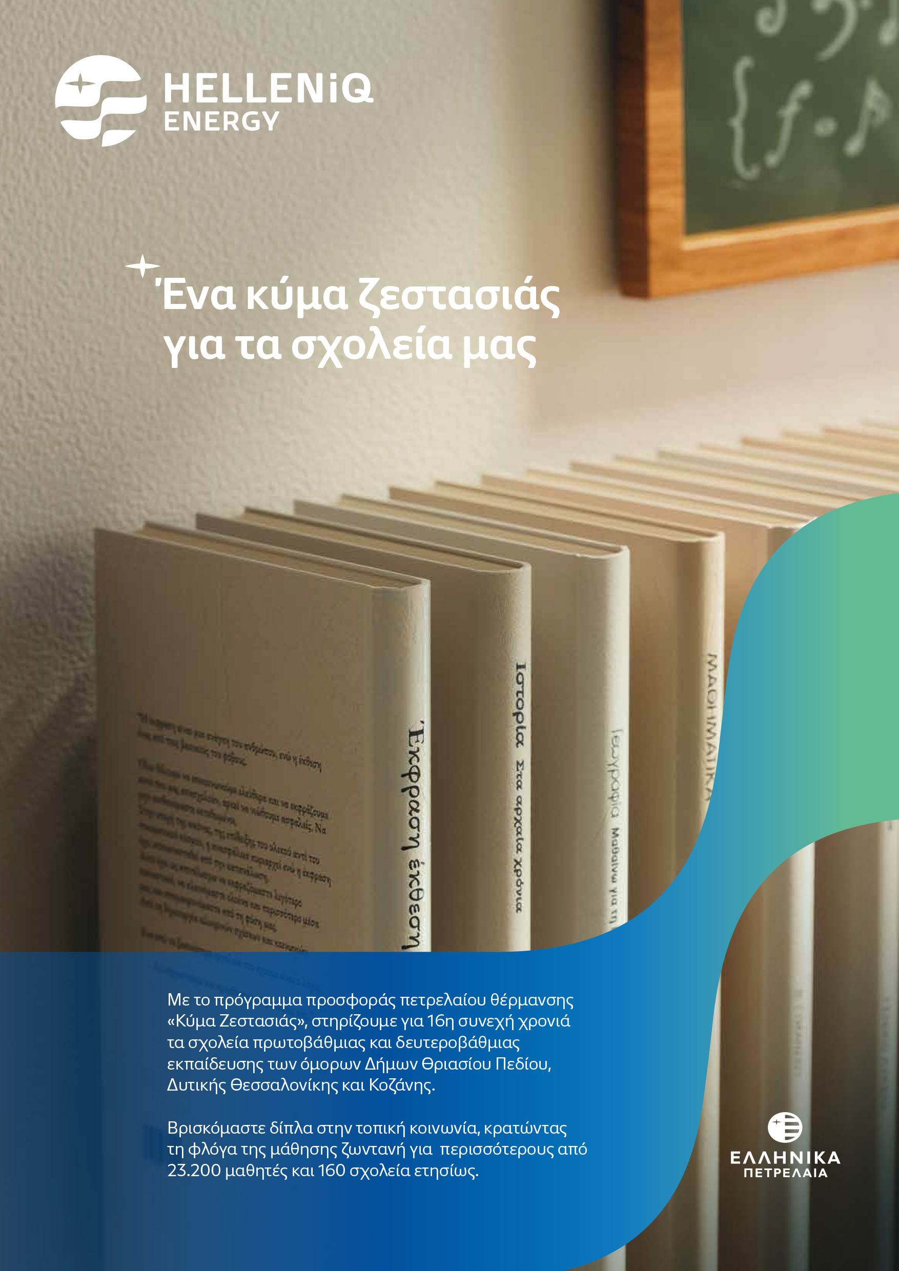 Για μια ακόμη χρονιά, ο Δήμος Κοζάνης συμμετέχει στο πρόγραμμα «Κύμα Ζεστασιάς» της HELLENiQ ENERGY, το οποίο, μέσω των θυγατρικών εταιρειών της ΕΛΛΗΝΙΚΑ ΠΕΤΡΕΛΑΙΑ και ΕΚΟ, προσφέρει δωρεάν πετρέλαιο θέρμανσης σε δημόσια σχολεία όλων των βαθμίδων, συμβάλλοντας στη διαμόρφωση ενός κατάλληλου περιβάλλοντος εκπαίδευσης.