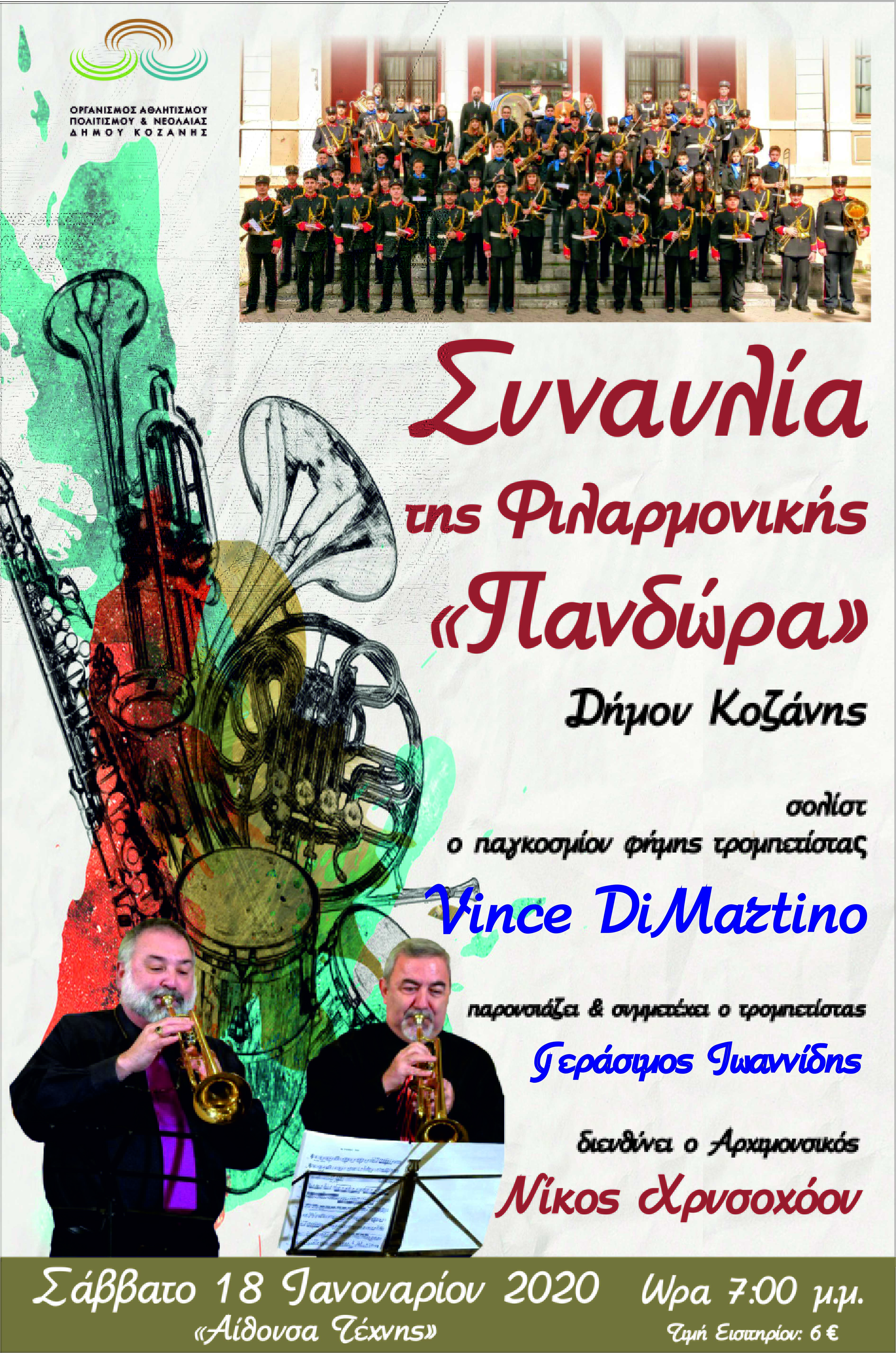 Η Φιλαρμονική του Δήμου Κοζάνης «Πανδώρα» θα πραγματοποιήσει μια μοναδική μουσική συνεργασία με τον παγκοσμίου φήμης τρομπετίστα Vince Di Martino το Σάββατο 18 Ιανουαρίου 2020 και ώρα 7:00 στην Αίθουσα Τέχνης.