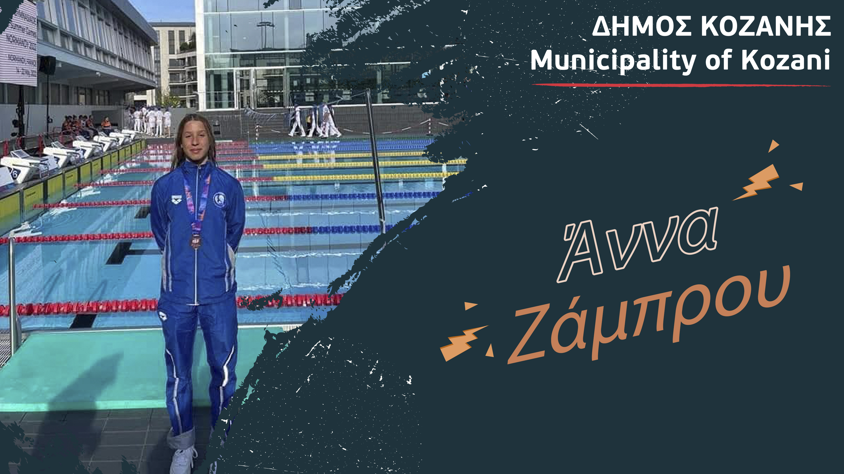 Ο Δήμος Κοζάνης εκφράζει τα θερμά του συγχαρητήρια στην πρωταθλήτρια της κολύμβησης, αθλήτρια της Κολυμβητικής Ένωσης Κοζάνης και μαθήτρια του 3ου Γενικού Λυκείου Κοζάνης, Άννα Ζάμπρου, για την κατάκτηση της 3ης θέσης στην Παγκόσμια Γυμνασιάδα στη Νορμανδία, στα 4*100 μικτή.