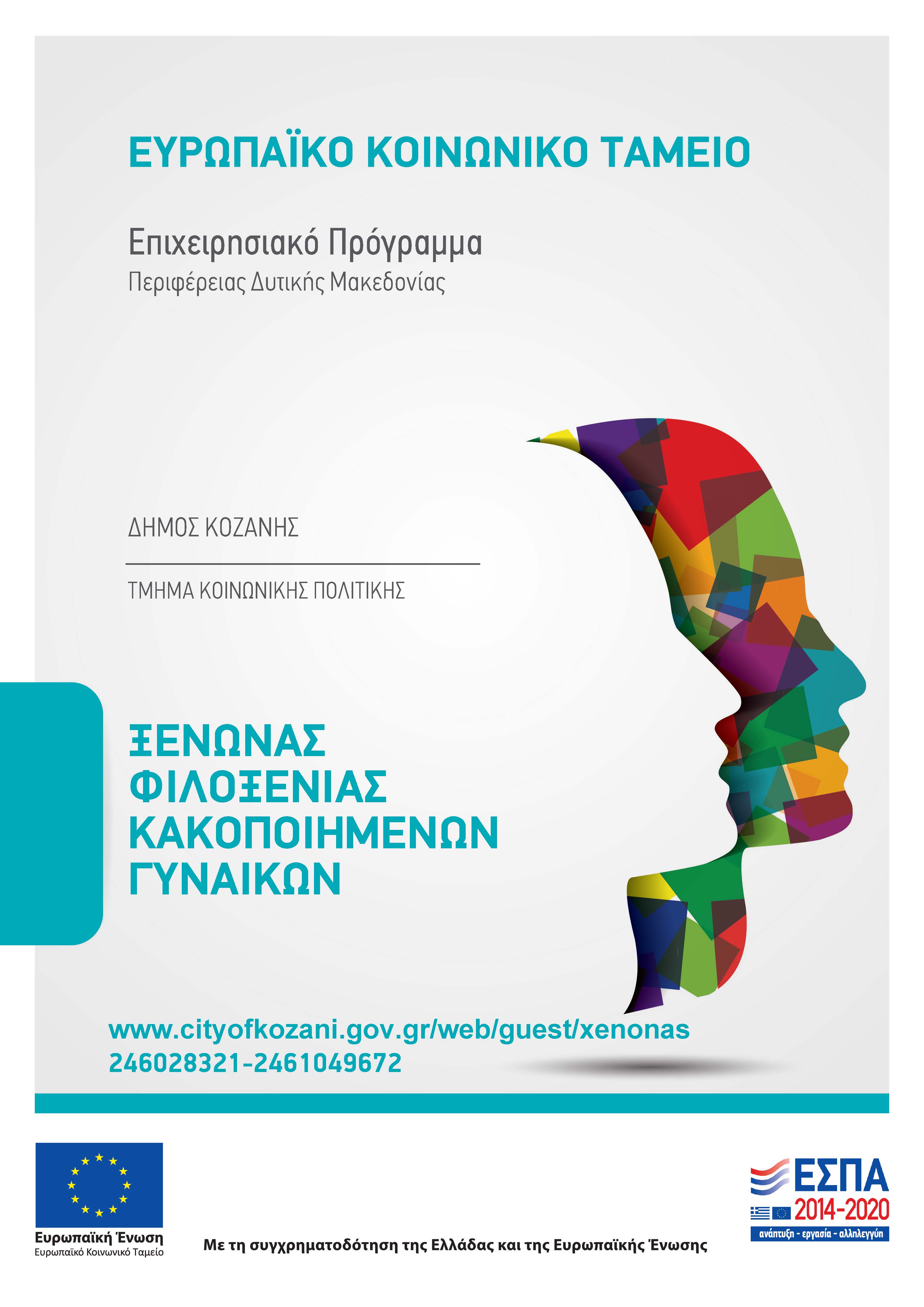 Ο Ξενώνας Φιλοξενίας Γυναικών Δήμου Κοζάνης συγχρηματοδοτείται από την Ελλάδα και την Ευρωπαϊκή Ένωση στο πλαίσιο του Περιφερειακού Επιχειρησιακού Προγράμματος Δυτικής Μακεδονίας 2014-2020.