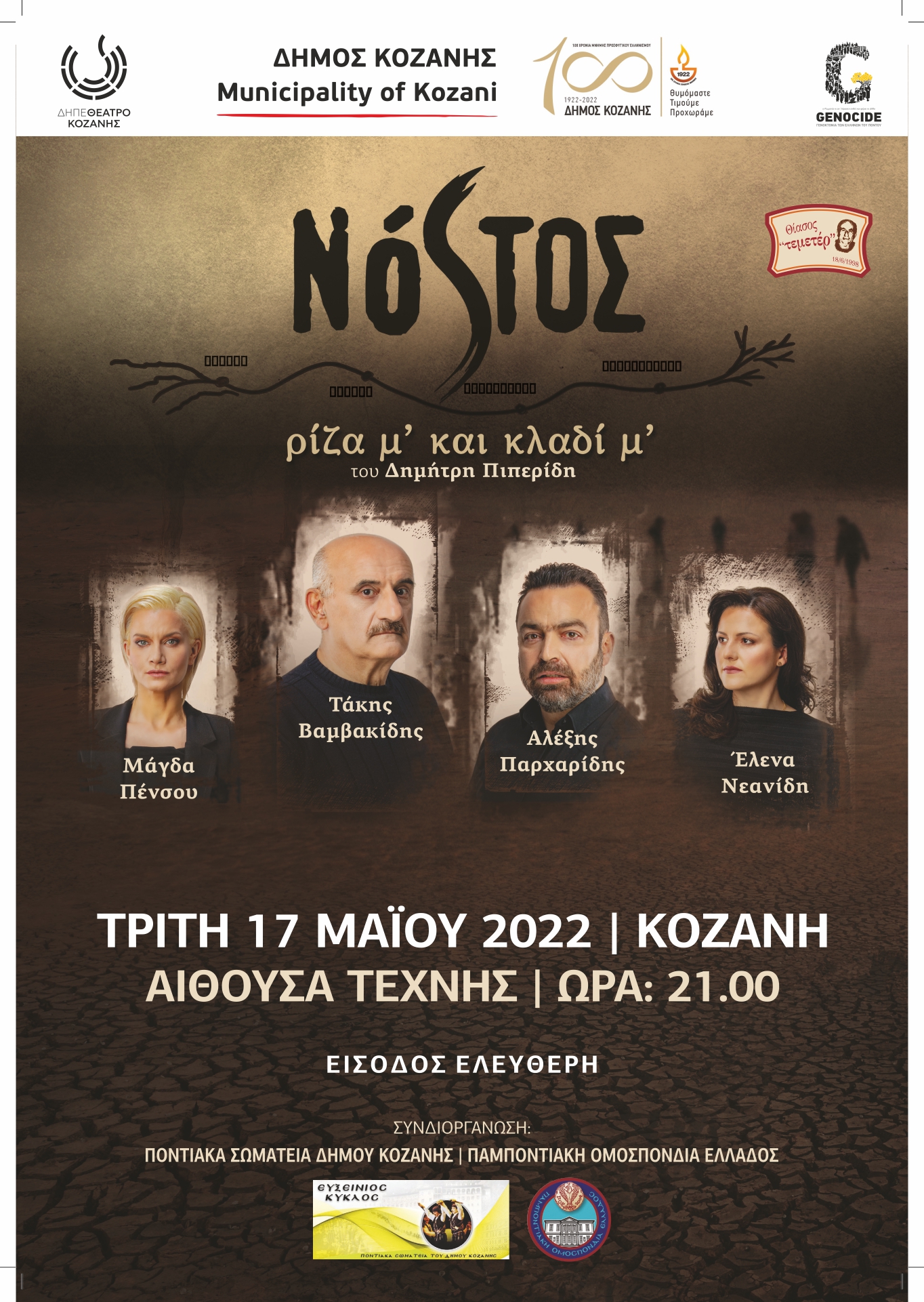 Ο Δήμος Κοζάνης και το ΔΗΠΕΘΕ Κοζάνης σε συνεργασία με τα Ποντιακά Σωματεία και το ΣΠΟΣ Δυτικής Μακεδονίας & Ηπείρου, στο πλαίσιο των επετειακών εκδηλώσεων για τα 100 χρόνια Μνήμης Προσφυγικού Ελληνισμού και με αφορμή την Ημέρα Μνήμης της Γενοκτονίας των Ελλήνων του Πόντου σας προσκαλούν την Τρίτη 17 Μαΐου, στην Αίθουσα Τέχνης Κοζάνης, και ώρα 21:00, στην παράσταση «ΝΟΣΤΟΣ ρίζα μ’ και κλαδί μ’…».