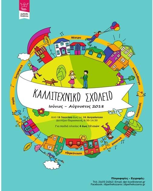 Το ΔΗΠΕΘΕ Κοζάνης ανακοινώνει την έναρξη του Θερινού Καλλιτεχνικού Σχολείου που θα λειτουργήσει το διάστημα από 18 Ιουνίου έως 10 Αυγούστου 2018 για παιδιά ηλικίας από 4 (γεννημένα πριν από την 1/1/2014) έως 12 ετών (παιδιά που φέτος τελείωσαν το δημοτικό).