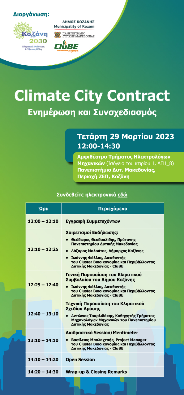 Το Cluster Βιοοικονομίας και Περιβάλλοντος Δυτικής Μακεδονίας (CluBE), o Δήμος Κοζάνης και το Πανεπιστήμιο Δυτικής Μακεδονίας, σας προσκαλούν στην ημερίδα με τίτλο "Climate City Contract: Ενημέρωση και Συνσχεδιασμός".