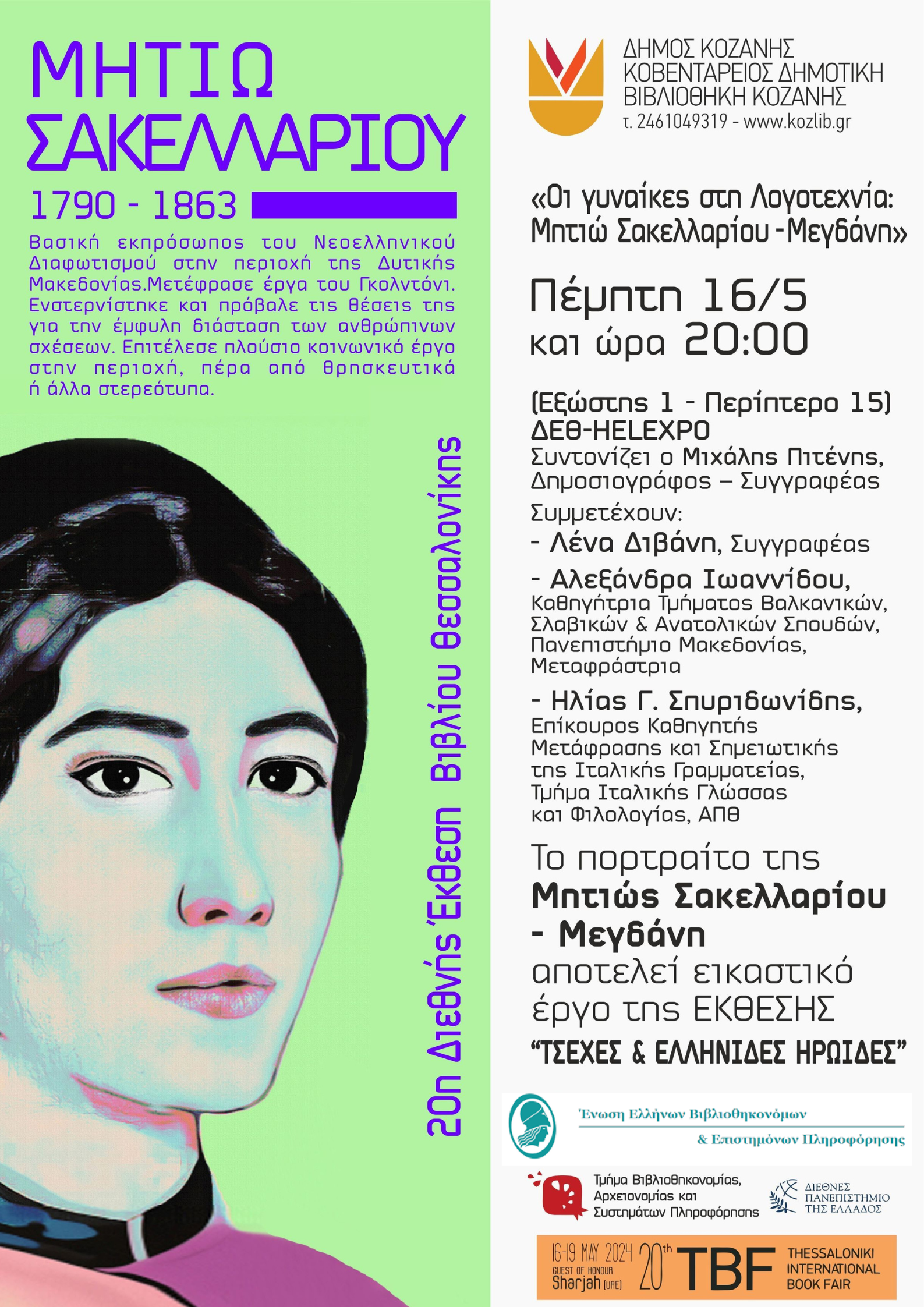 Στο πλαίσιο της 20ης Διεθνούς Έκθεσης Βιβλίου Θεσσαλονίκης, η Κοβεντάρειος Δημοτική Βιβλιοθήκη Κοζάνης σας προσκαλεί στην Στρογγυλή Τράπεζα με θέμα: «Οι Γυναίκες στη Λογοτεχνία: Μητιώ Σακελλαρίου - Μεγδάνη», την Πέμπτη 16 Μαΐου 2024 και ώρα 20:00, στον Εξώστη 1 - Περίπτερο 15 -  ΔΕΘ - HELEXPO.