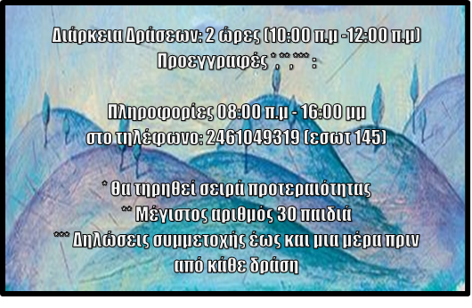 το παρακολουθήσουν παιδιά ηλικίας 4 έως και 12 ετών. Οι δραστηριότητες διάρκειας 2 ωρών (10:00 π.μ - 12:00 π.μ,) θα γίνουν όλες στους χώρους της Βιβλιοθήκης και σε κάθε μια απ’ αυτές ο μέγιστος αριθμός των παιδιών που θα μπορούν να συμμετάσχουν θα είναι τριάντα (30), ενώ κάθε παιδί θα μπορεί να συμμετάσχει σε όποιες δραστηριότητες θέλει. Για το λόγο αυτό θα τηρηθεί σειρά προτεραιότητας κατά την δήλωση των συμμετοχών.