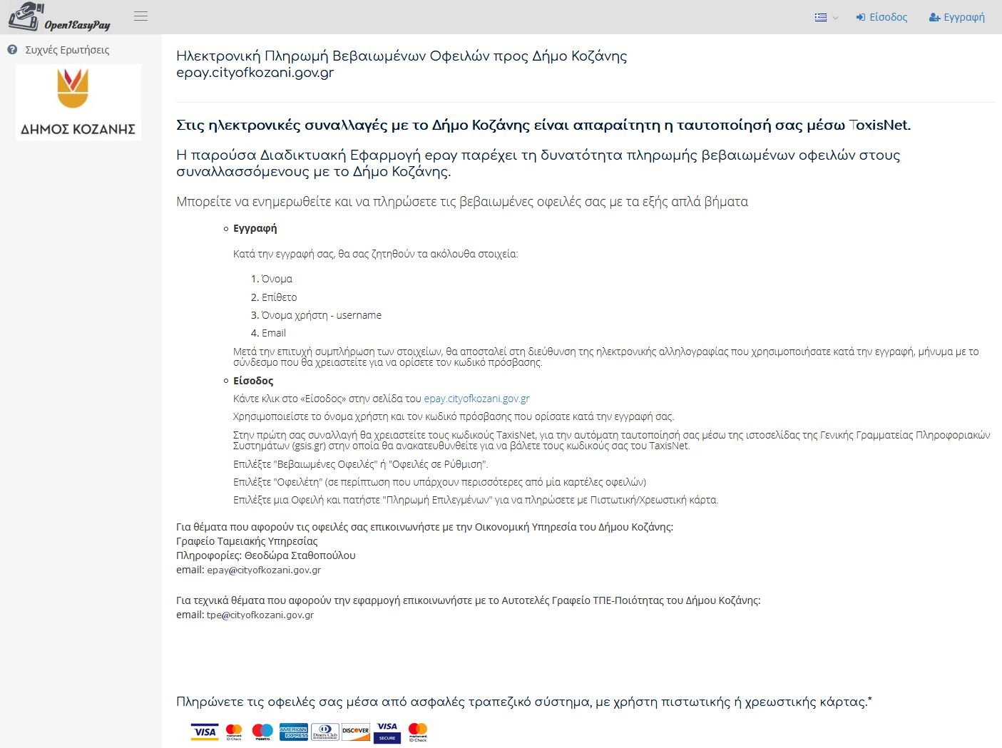 Ο Δήμος Κοζάνης παρέχει σε φυσικά και νομικά πρόσωπα ή νομικές οντότητες τη δυνατότητα ενημέρωσης και διεκπεραίωσης ηλεκτρονικών πληρωμών για τις βεβαιωμένες οφειλές τους προς τον Δήμο, με τη χρήση Πιστωτικής/Χρεωστικής Κάρτας μέσω της Διαδικτυακής (Web-Based) Εφαρμογής “epay”.