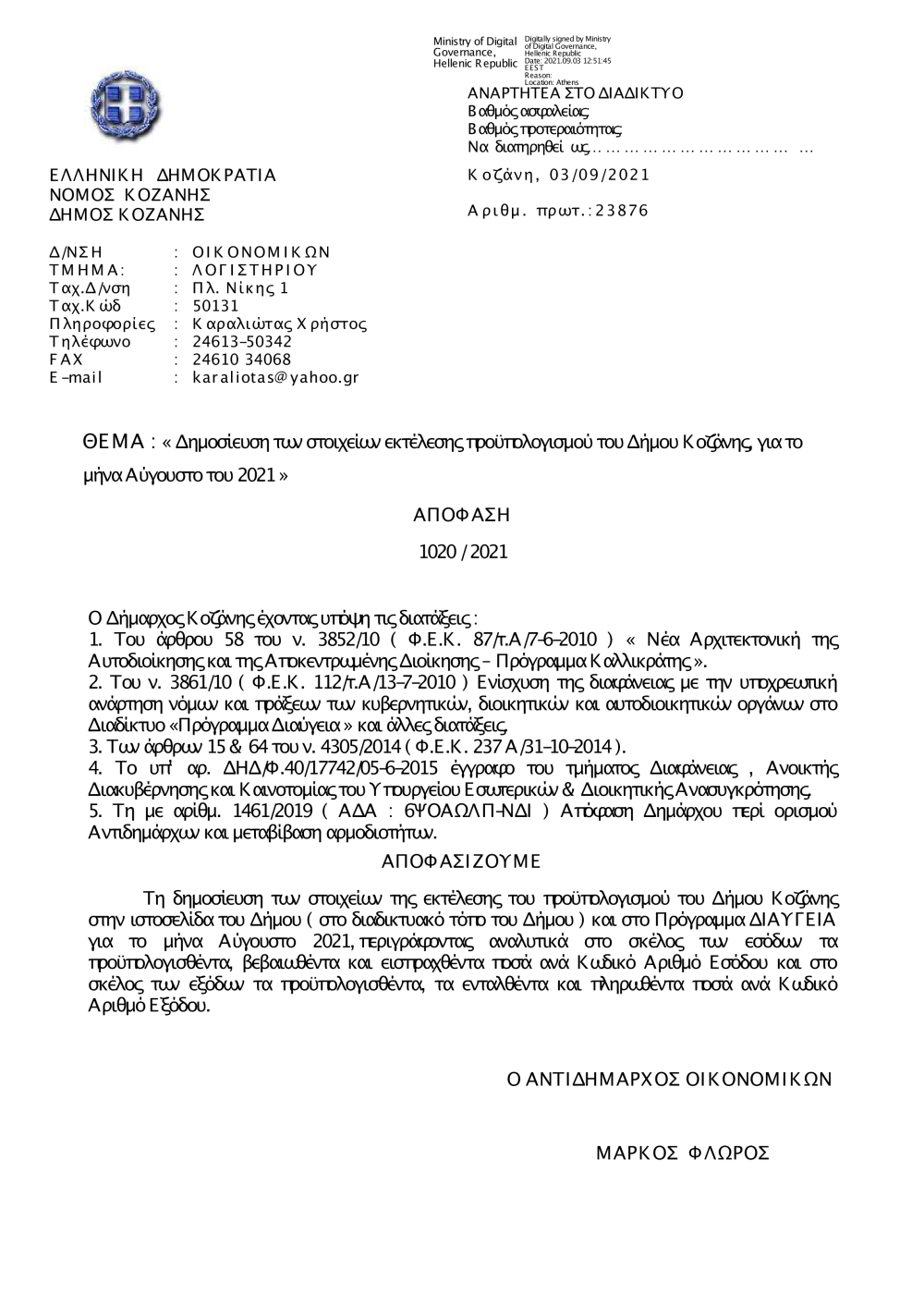 Ανέβηκε από τον/την Τόλης Τσιρούδης, 3/9/2021 4:13 μμ Οικονομικά Στοιχεία: Εκθέσεις Οικονομικής Επιτροπής για τα αποτελέσματα Εκτέλεσης του Προϋπολογι