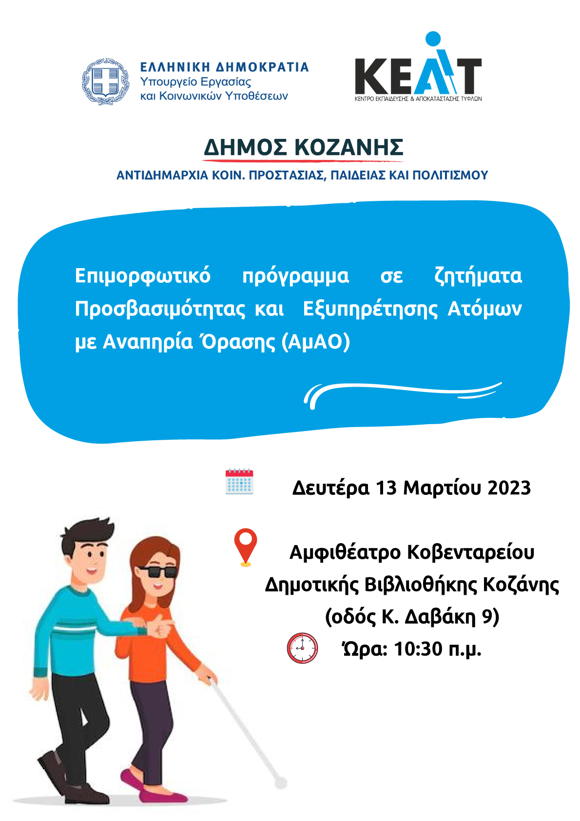 Η Αντιδημαρχία Κοινωνικής Προστασίας, Παιδείας και Πολιτισμού του Δήμου Κοζάνης σε συνεργασία με το Κέντρο Εκπαίδευσης και Αποκατάστασης Τυφλών, διοργανώνουν επιμορφωτικό πρόγραμμα σε ζητήματα προσβασιμότητας και εξυπηρέτησης ατόμων με αναπηρία όρασης,  τη Δευτέρα 13 Μαρτίου 2023  και ώρα 10.30, στο Αμφιθέατρο της Κοβενταρείου Δημοτικής Βιβλιοθήκης Κοζάνης, οδός Κ. Δαβάκη 9 .